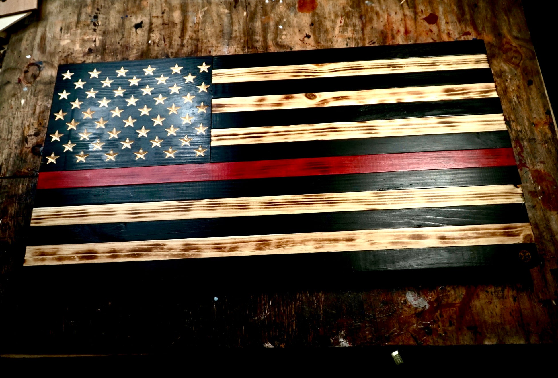 I hand pick each 2x12 pine board to made sure I'm using the very best lumber. Each board is planed to get a flat surface then milled to size. Each strip (1.5" wide & 1" thick) is a single piece of wood and the banner (star area) is one solid block of wood as well. I've designed the stars and they are are cut to perfection with my CNC machine. The stars have been designed to have an angle inside the deep 7/8" cut that's also 1" across. The boards are then hand-torched to give an aged rustic look. After painting they are glued up with high-end wood glue and clamped over night. After the glue is dry it has become one solid block of wood what will not come apart. The final step is to apply polyurethane to seal the wood and give it a semi-gloss finish. High-end hangers our added to the back and I also include wood screws for mounting to a stud and heavy duty drywall screws. This is a process I take seriously to make sure each one of my flags will look amazing in your home or office and stand the test of time.