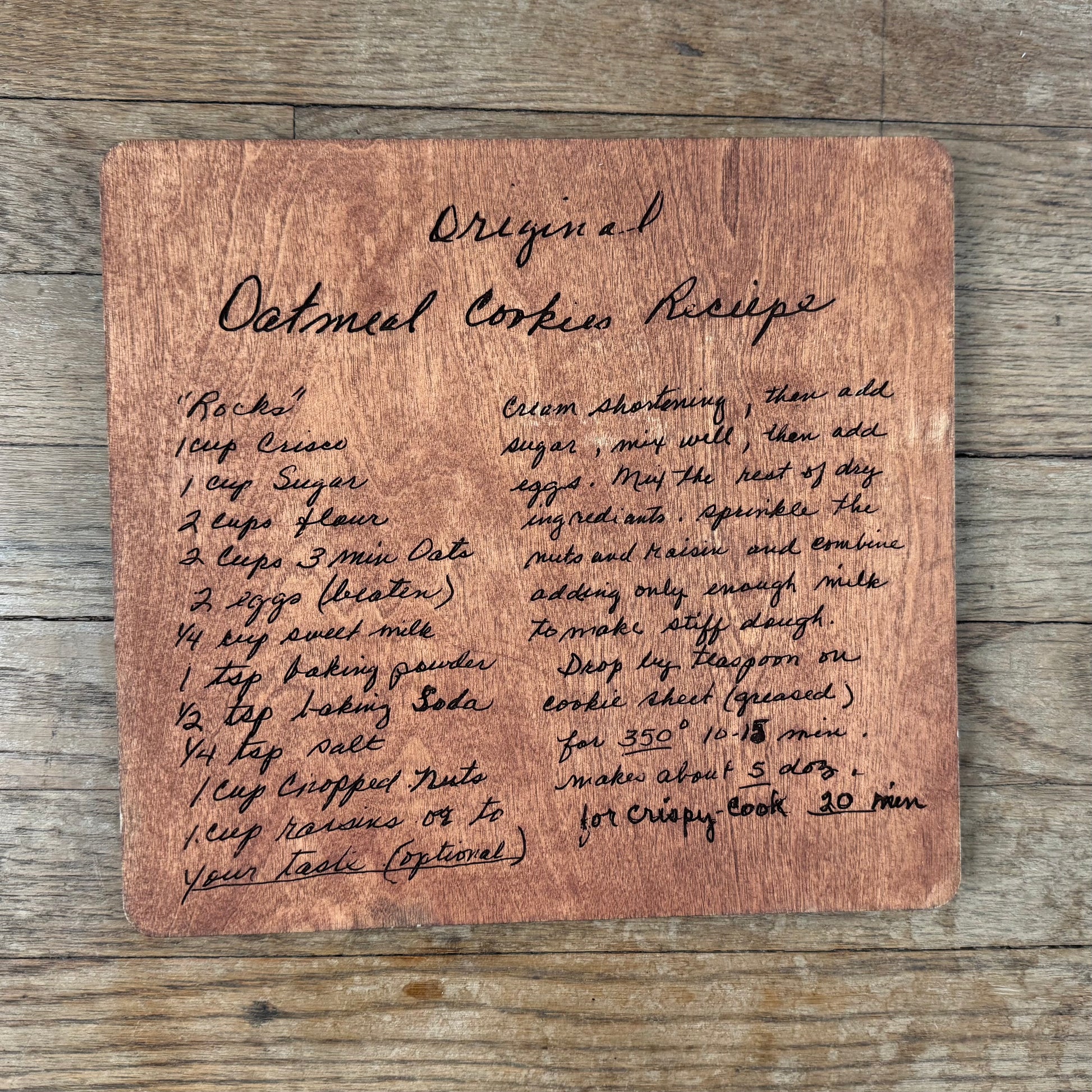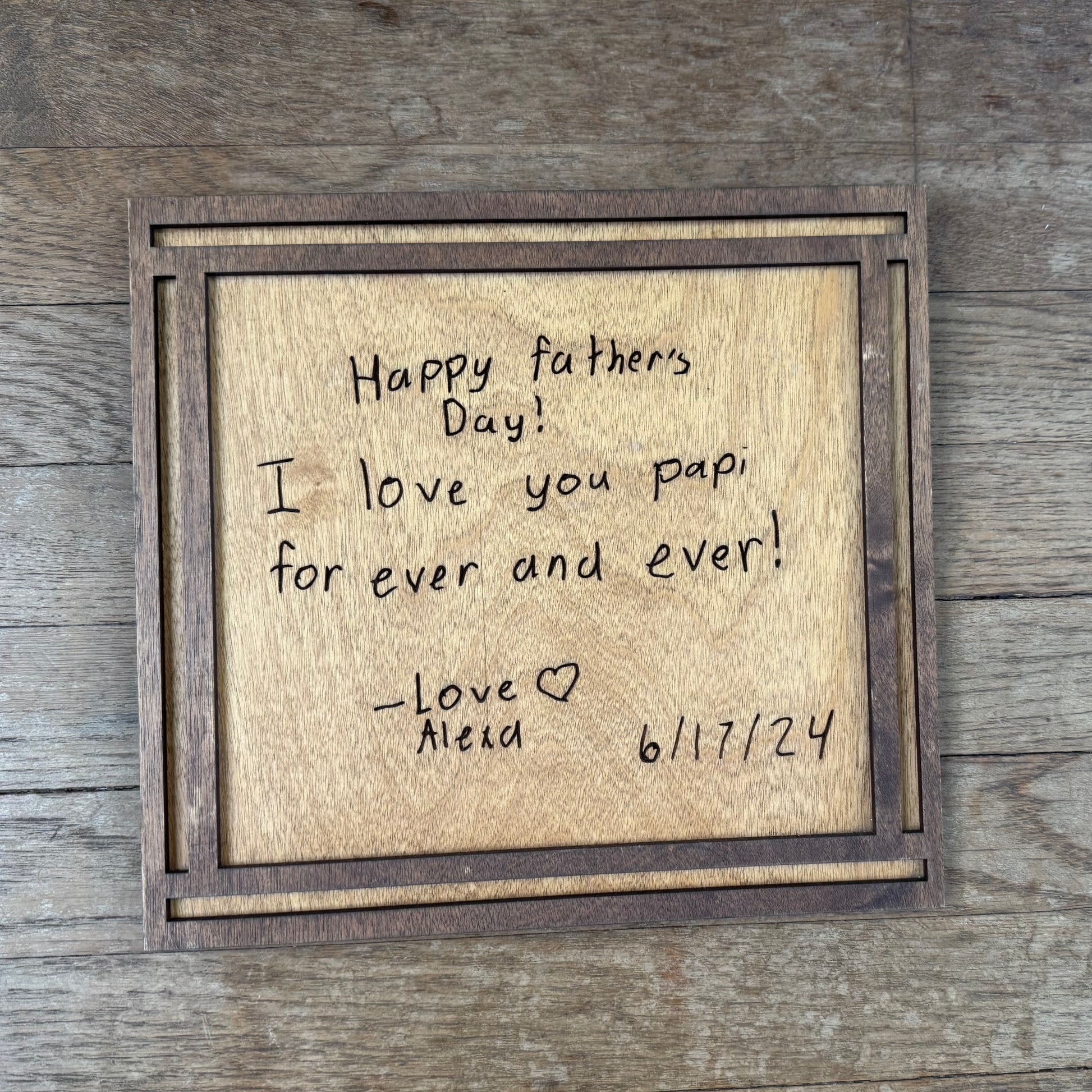 We can take your familles member's personal handwriting and create a special keepsake. Just upload an image of the handwriting you'd like to use and we'll take it from there. Once your order is placed, within 2 weeks we will create the project design and will send to you for approval. Once approved we will then put it in line to be made. We ship all over the country or if you are local to San Antonio up can select to pick it up at our store.