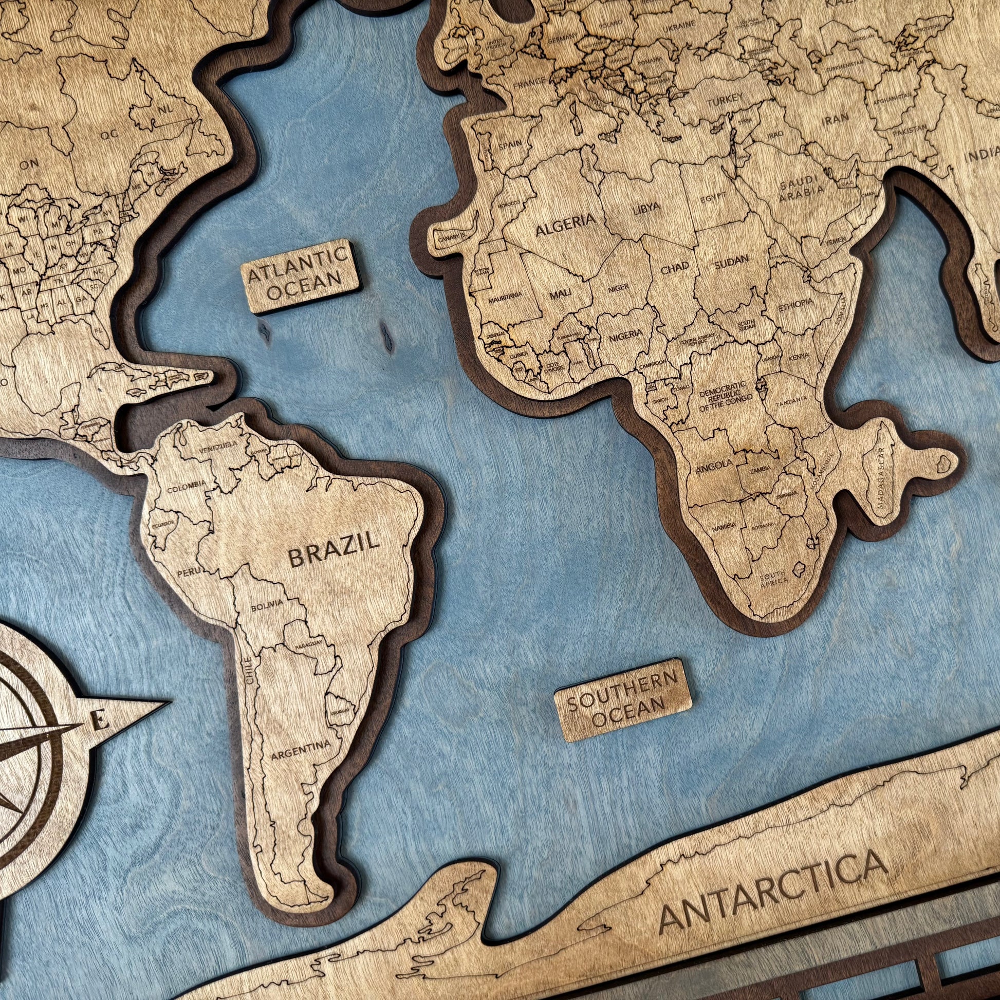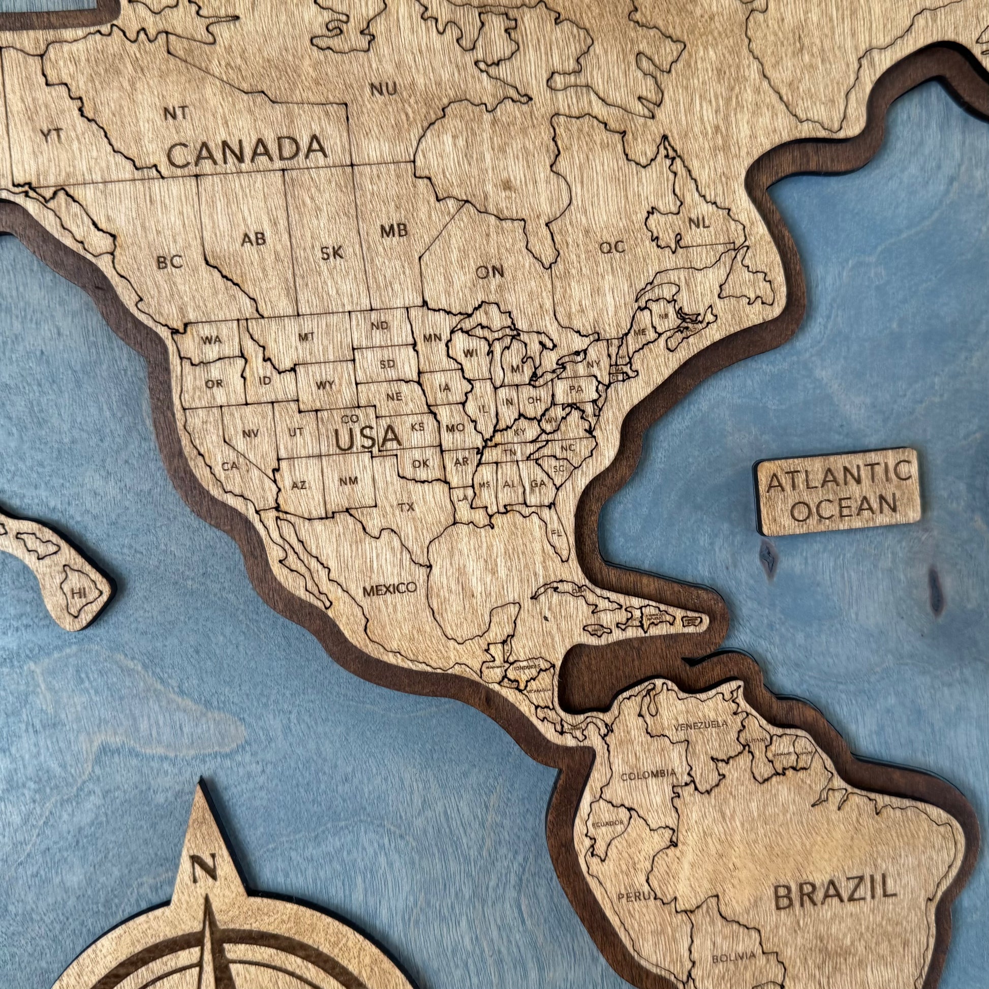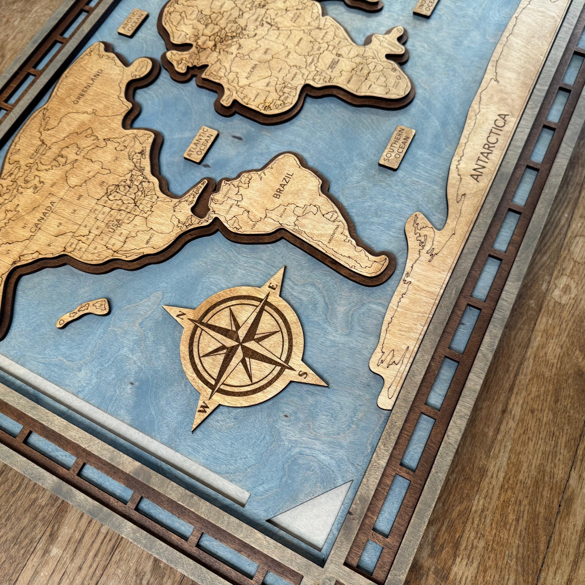 Our World Map is a beautiful custom framed piece. Come in two sizes, 23.5" x 15.34" & 34" x 22". Designed and built in Helotes Tx. Each part is stained and put together by hand. It comes with a built-in hanger, ready to put on the wall when it arrives. Each one is a made to order and will ship within 1 week from when your order is placed.
